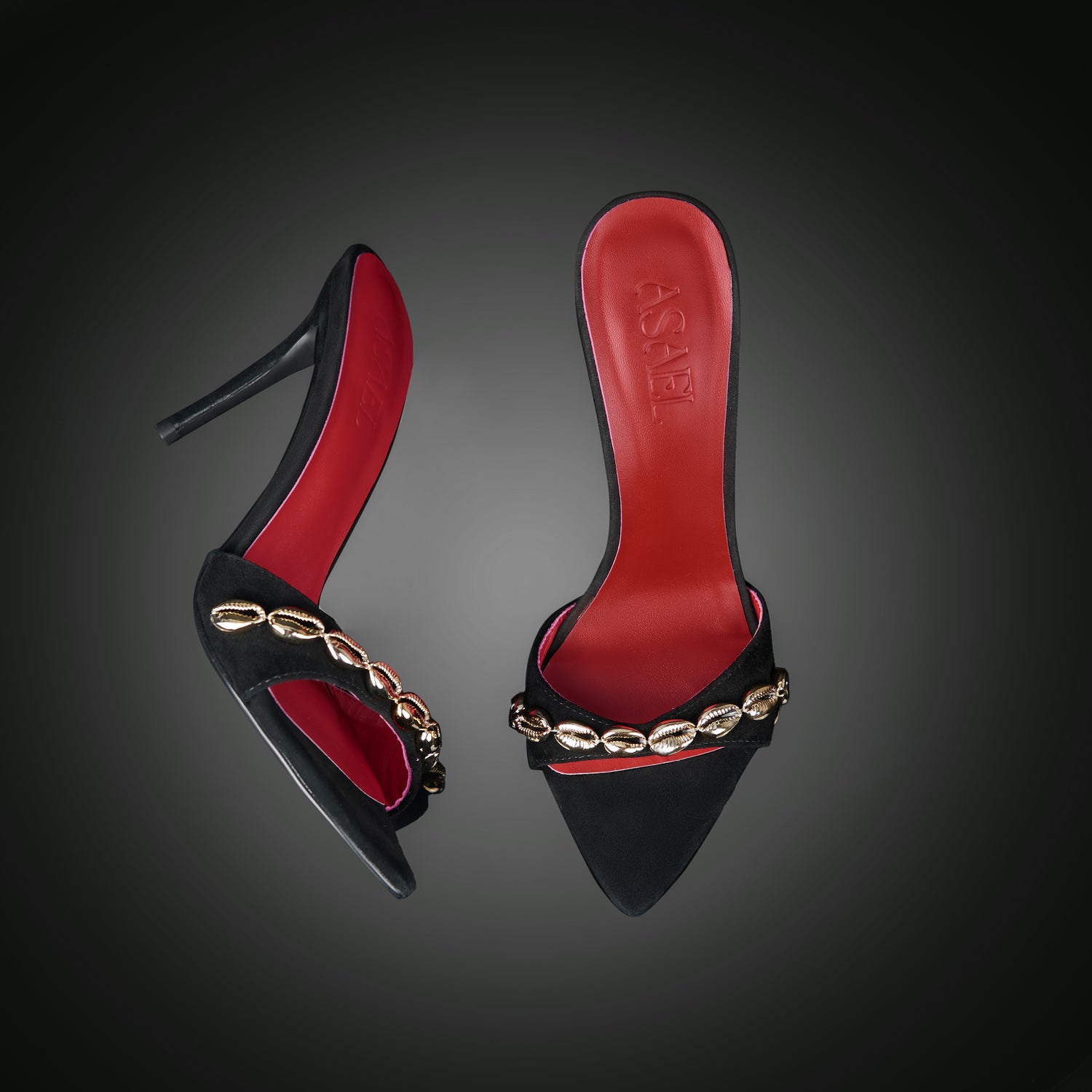 Le noir profond du velours rencontre l’éclat doré des cauris. Une mule qui ne suit aucune tendance, elle les crée.