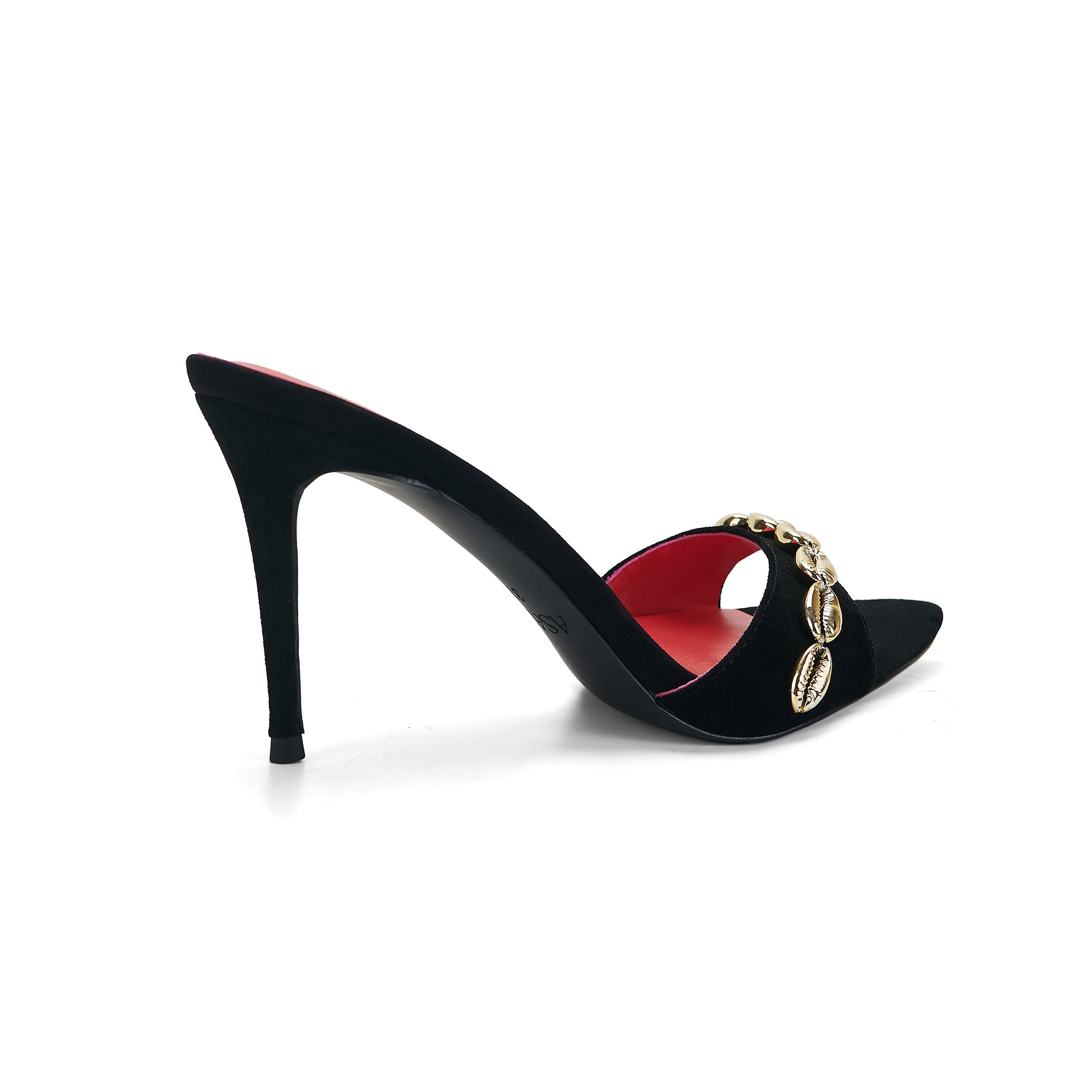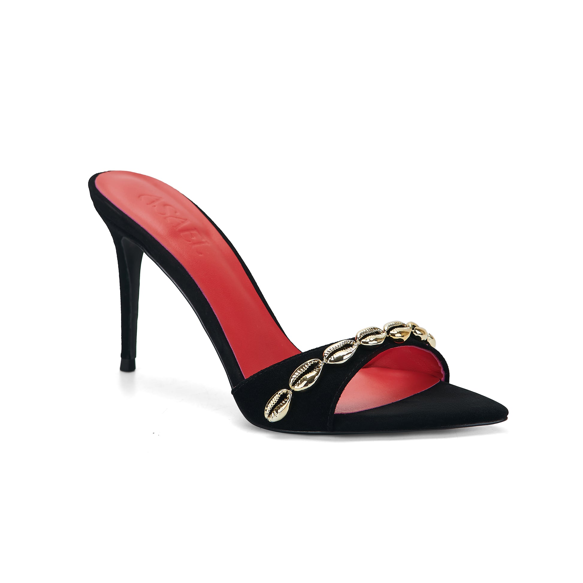 « Assinie est une ode à mes souvenirs d’enfance en bord de lagune. Les cauris dorés rappellent les trésors naturels, précieux et spirituels, que l’on trouve dans nos traditions. Cette mule incarne le luxe discret et l’héritage que l’on porte fièrement. »